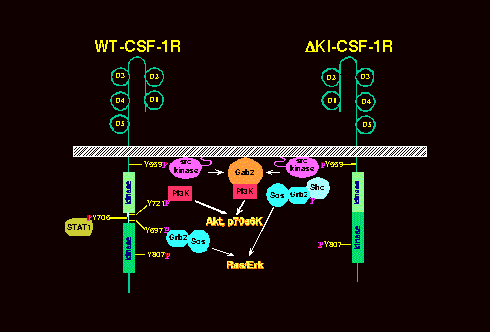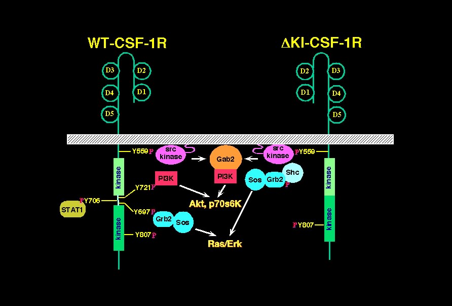 Description of Lab ProjectsCellular responses to activation of growth factor receptors is dictated by the repertoire of signaling molecules present within a given cell type. We identified a novel mechanism utilized by the CSF-1R for activating the phosphatidylinositol 3-kinase (PI3K)/Akt survival pathway in the 32D myeloid cell line (Fig. 1). Unlike the previously described pathway involving direct CSF-1R:PI3K binding, this novel mechanism is activated by a deletion mutant of CSF-1R (DKI) that cannot bind PI3K. Using both pharmacological and genetic approaches, we determined that the novel pathway involves a CSF-1R-Src-Gab2-PI3K link. Src family kinases are cytosolic tyrosine kinases whereas Gab2 is a recently identified docking/scaffolding molecule that may play a particularly important role in hematopoietic systems. Current research focus is to further delineate the roles of Src and Gab2 in mediating CSF-1 signals necessary for growth and survival. Additional recent studies from our lab have revealed that the DKI mutant is mitogenically defective and undergoes a novel form of cell death that appears to be largely independent of caspases and mitochondrial dysfunction. Complementation with constitutively active downstream signaling molecules in combination with gene expression microarray profiling are in progress to further elucidate the mechanisms of cell growth and death. Recent exciting results in the lab point to an essential role for Gab2 in maintaining neural stem cell proliferation (self-renewal). Since a multitude of receptor tyrosine kinases are found in neural stem cells and their differentiated progeny (neurons, astrocytes and oligodendrocytes), this has significant implication. In addition, we have turned to mouse models to examine how CSF-1 and CSF-1R regulate the commitment of hematopoietic progenitors to the monocyte/macrophage lineage. As monocytes and macrophages are major effectors of innate immunity and integral modulatory cells found in many pathological conditions such as cancer, diabetes and Alzheimer's disease, it is important to understand how these cells are recruited from the bone marrow. A future goal is to understand the origin of tumor associated macrophages (TAMs) and the signals that promote their recruitment to tumor sites. Further description of individual projects is provided in the individual links.